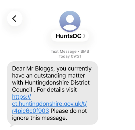We will never ask you for your bank account details. The link in our messages will always start with ct.huntingdonshire.gov.uk (please note - you cannot reply to this email address).
